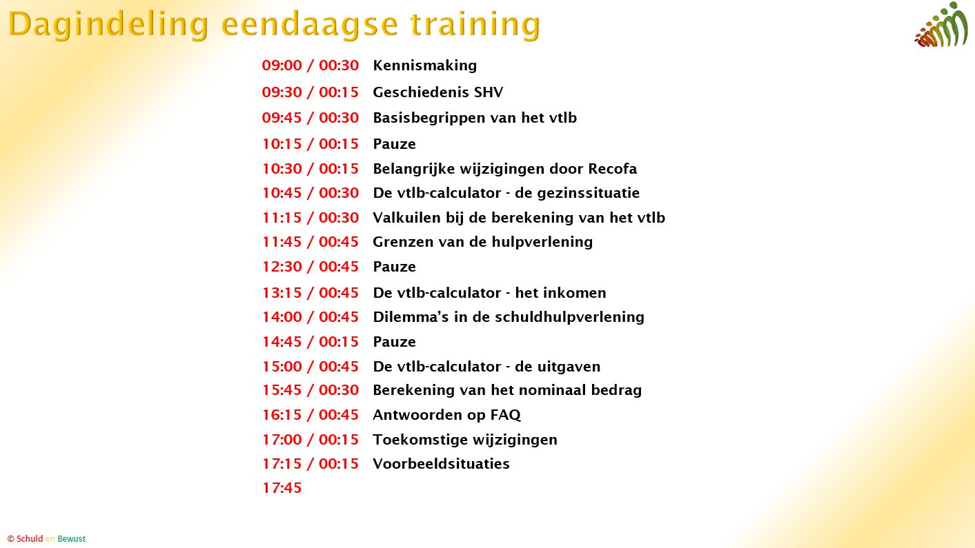 Deze training is bedoeld voor inkomensconsulenten, budgetbeheerders, casemanagers en schuldhulpverleners die te maken hebben met het berekenen van het vrij te laten bedrag. Bij voorkeur geven wij les aan deelnemers uit meerdere disciplines, omdat dit het spreken van een gemeenschappelijke schuldhulpverleningstaal bevordert en tot daadwerkelijke integrale schuldhulpverlening leidt.